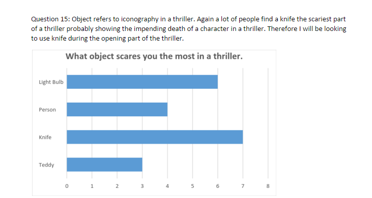 These questions has helped me plan my final product, we found what type thrillers that our target audience enjoyed the most.