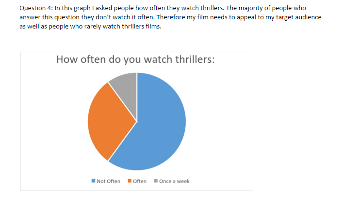 While researching into thrillers I carried out a questionnaire in order to gain valuable feedback from those I was trying to directly address. The purpose of this questionnaire was to find out what their opinions were about thrillers in order for me to represent them into my work. I ensure that the people I asked to fill this out were people who would most likely watch my work in the real world.Here are 4 key questions that helped me making key decisions about my thriller.